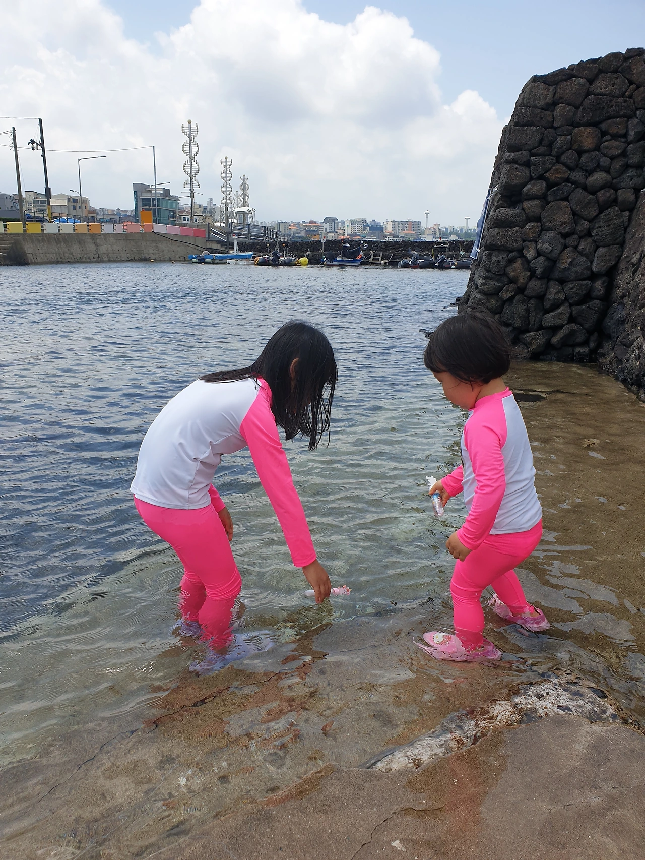 샛도리물 이곳저곳을 다니며 발을 담그고 노는데 캠핑 중인 가족을 만났다. 남양주에서부터 캠핑카를 끌고 제주 한 달 살기를 하러 오셨다고 했다. 넉넉한 마음씨를 가지신 어머니는 튜브를 빌려주셨고 아이들은 금세 친해져서 한참을 수영하며 물놀이를 하며 즐거운 시간을 보냈다. 오조리에 물때를 맞춰가면 조개도 캘 수 있다며 유익한 정보도 알려주셨다. 아이들은 더 놀고 싶어 했지만 물이 차가워서 젖은 옷으로 계속 있으면 감기에 걸릴까 봐 걱정이 되었고, 비가 올 것 같은 날씨로 인해 더 이상 함께 놀기는 힘들 것 같았다. 인연이 된다면 여행 중에 다시 만나자고 하고 헤어졌다.