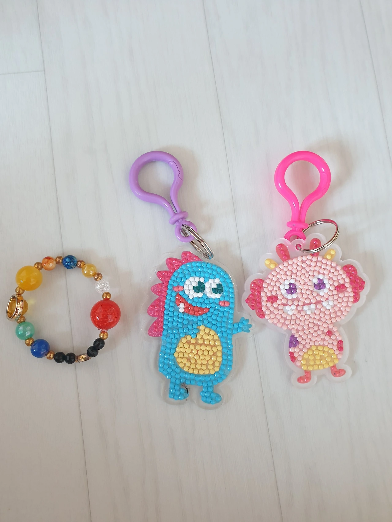 첫째는 핑크 도깨비 열쇠고리, 둘째는 파란 공룡 열쇠고리 키트를 선택했다. 열쇠고리 키트는 알갱이 같은 점을 하나씩 펜으로 집어서 불여야 한다.