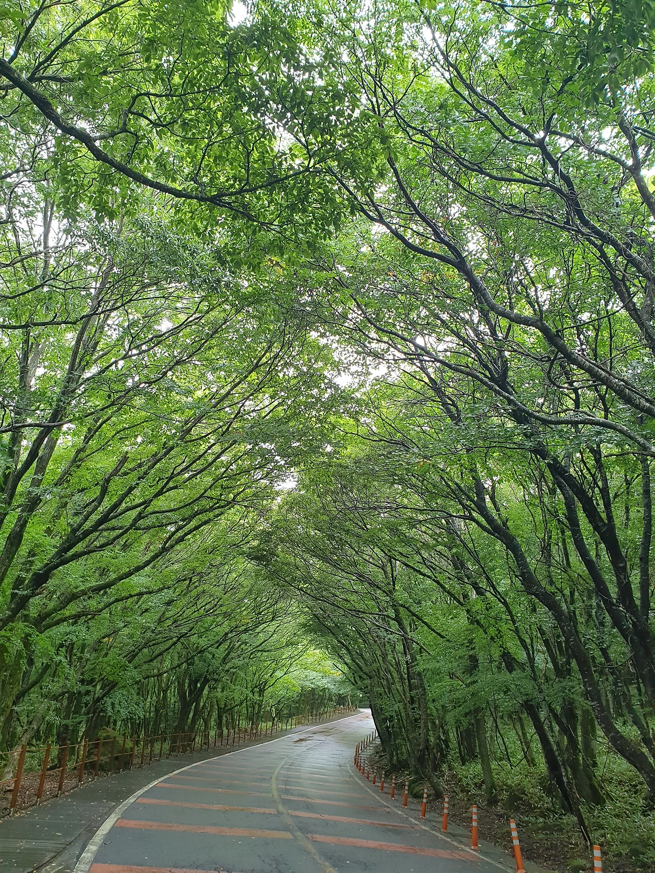 갈림길이 나타난다. 왼쪽이 어리목 매표소이다. 중문 방향으로 가지 않도록 긴장한다. 여기부터는 지난번과는 다른 새로운 길이다. 경사가 더 높아진다. 비가 잠시 소강상태라 에어컨을 끄고 창문을 내린다. 비에 젖은 촉촉한 숲의 공기가 상쾌하다. 새소리, 매미 소리, 비 냄새, 나무 냄새.. 숲의 모든 것이 좋다.