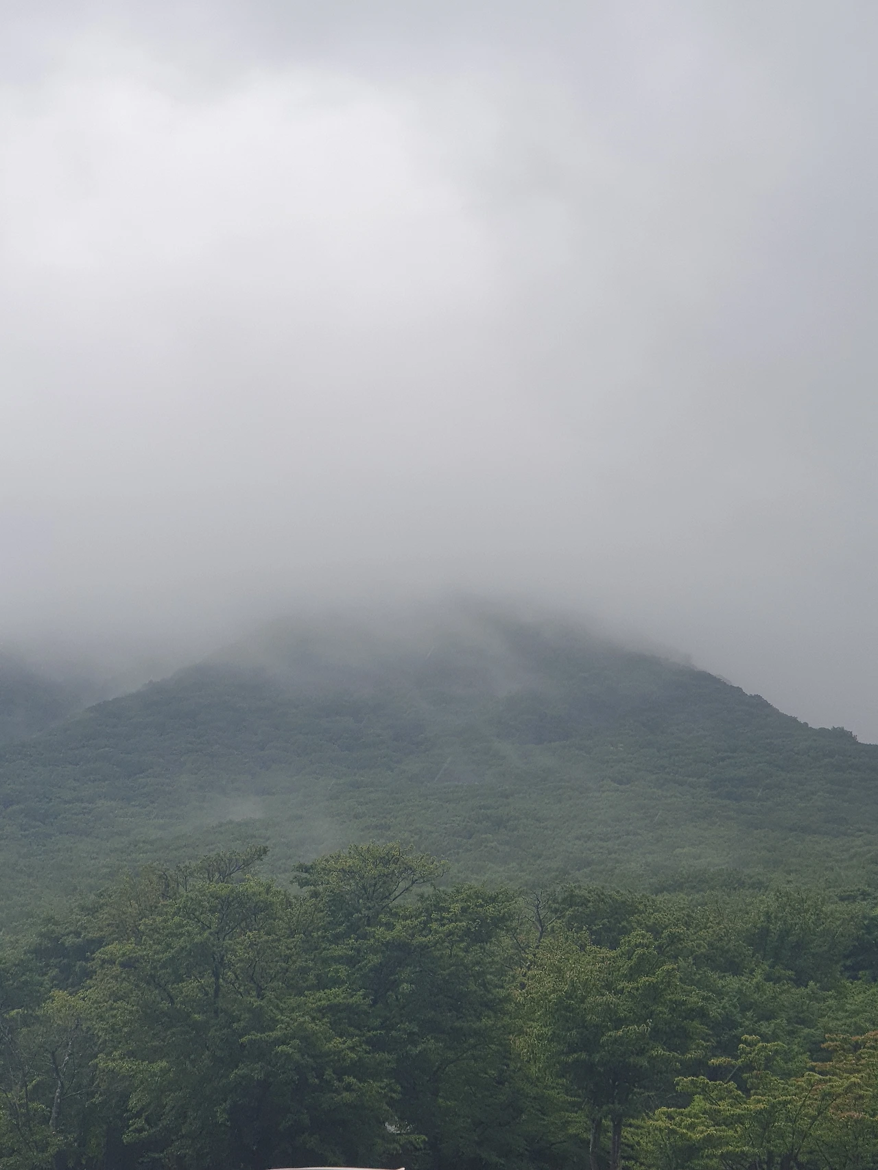 드디어 도착했다. 비바람이 매우 거세다. 역시 오늘도 날을 잘 못 잡았다. 날씨만 맑았다면 한라산 숲길을 따라 올라가도 좋았을 것 같다. 갈길 못 정한 여자 마음처럼 날씨가 오락가락한다. 우산을 날릴 정도로 강한 비바람이 불었다가 갑자기 멈추고를 반복한다. 날씨 따라 움직인다. 비가 쏟아지면 차로 대피하고 비가 멈추면 나와서 연무 가득한 한라산 구경하고 사진도 찍고 화장실도 다녀온다. 마치 눈치 보며 땅구멍을 들락거리는 들쥐 같다.