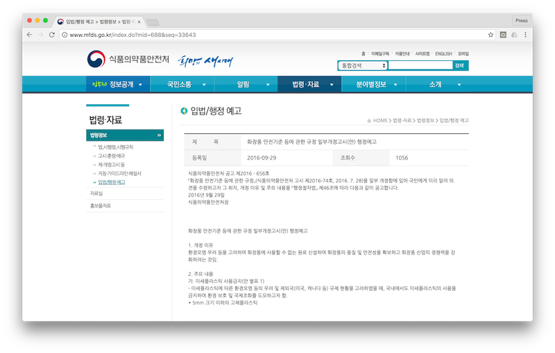 이번 개정은 화장품 법 관련 고시로는 최초로 환경오염에 대한 우려를 근거로 마련되었습니다. 그래서 특히나 반갑고도 소중한 변화라고 볼 수 있습니다. 향후 다양한 생활용품 속 유해물질을 관리하고 규제하는 데 있어 좋은 선례를 남기기 때문입니다.