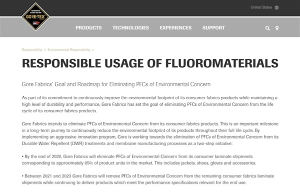 전 세계 방수/방풍/투습 소재 시장을 선도하고 있는 고어社 섬유사업부는 2020년 말까지 일반 아웃도어 제품용 소재에서, 그리고 오는 2023년 말까지는 전문 아웃도어 제품용 소재에서도 유해성 PFC 사용을 중단할 것을 악속했습니다. 이로써 2020년까지 고어社 섬유사업부 제품의 85%에서, 2023까지는 전체 제품에서 유해성 PFC가 사라지게 될 예정입니다.