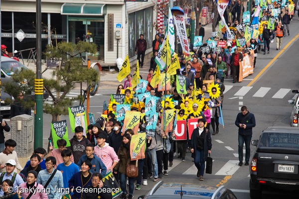 ‘쿵쿵쿵' 타악기의 신나는 리듬에 맞춰 행진하는 이들의 손에는 형형색색의 피켓이 들려있습니다. 흥겨운 음악 소리에 맞춘 발걸음, 해님 꽃 모자에 알록달록 현수막까지 들고서 “석탄그만”을 외치러 먼 데 ‘당진’까지 한달음에 달려온 이들이 있습니다. 지난 3월 25일, 세계최대 석탄화력발전소가 위치한 당진으로, 전국 각지에서 모여든 1천여 명이 바로 이들이죠.