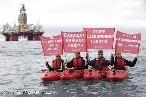 시추 장비를 막아선 활동가들은 북극에서 석유 시추를 중단하라는 메시지가 담긴 현수막을 펼치기도 했습니다. 몇 시간이 지난 후 노르웨이 해안 경비대는 평화로운 시위를 펼치던 활동가들과 ‘아틱 선라이즈'호, 그리고 승무원들을 체포했습니다.