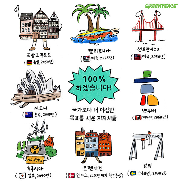 샌프란시스코(미국)와 시드니(호주), 말뫼(스웨덴)는 2030년, 후쿠시마(일본)는 2040년까지, 그리고 밴쿠버(캐나다)와 프랑크푸르트(독일)는 2050년까지 재생가능에너지 비율을 100%로 끌어올리기로 약속한 도시들입니다. 코펜하겐(덴마크)은 2025년까지 ‘탄소 중립’ (탄소 배출과 흡수량이 같아져서 탄소 순 배출량이 0에 이르는 현상)을 달성하고자 합니다.