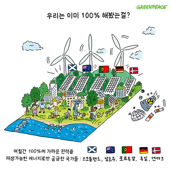여러분들을 놀라게 할 만한 소식들이 있습니다. 이미 지구 곳곳에서 하루 특정 시점에 혹은 며칠동안 100% 재생가능에너지만으로 국가 전체의 전력을 공급한 국가들이 있다는 것입니다. 믿겨지지 않는다고요?