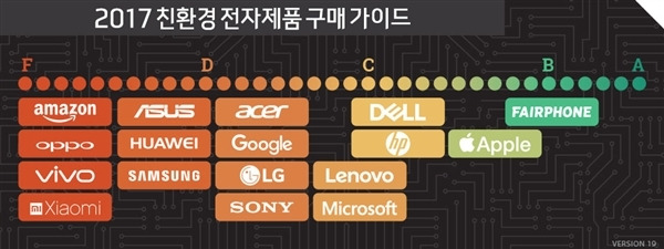 그린피스는 어떤 기업들이 이와 같은 방향으로 나아가고 있는지 보다 정확히 판별하기 위해 <2017 친환경 전자제품 구매 가이드>를 발표했습니다. 지구를 보호하기 위해 기업들이 시급히 변화해야 하는 세가지 중점분야(1) 재생가능에너지 사용 2) 자원소비 절감 3) 유해화학물질 제거)를 선정, 약 2년에 걸쳐 세계적으로 가장 영향력이 높은 17개의 전자기기 제조사(스마트폰, 태블릿PC, PC)를 평가했습니다.