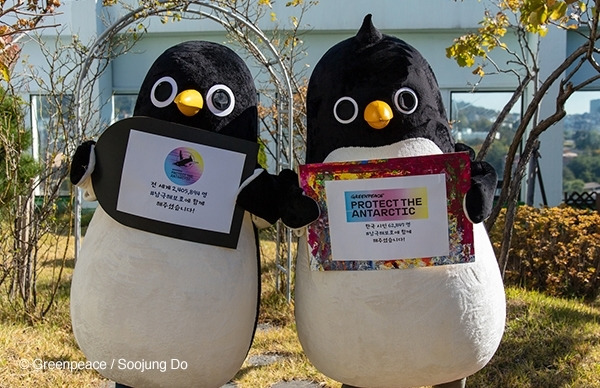 서울에서도 그린피스 서울사무소의 마스코트 펭귄 똑이와 타미가 시민 6만명의 남극 보호 목소리를 담은 소중한 메세지를 한국 정부에 전달했습니다. 이외에도 러시아, 일본, 중국, 노르웨이 등 전 세계에서 남극해 보호 지정을 위해 서명한 260만명의 목소리를 알리기 위한 전달식은 계속됐습니다.