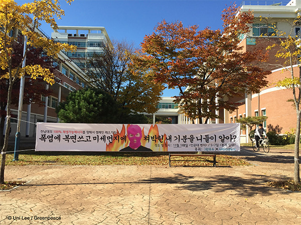 그린피스와 함께 기후변화 대응에 앞장서는 전국거점국립대학교 대학생 연합 그린유스는 자신이 속한 대학교에서부터 기후변화 시대를 이겨낼 방법을 찾을 수 있지 않을까 고민하기 시작했습니다. 대학교가 기후변화 대응에 솔선수범한다면, 그 학교에서 미래 리더로 성장하기 위해 공부 중인 대학생이 보고 배울 수 있기 때문입니다. 또한, 동문회와 교수진은 물론 주변 지역사회도 기후변화 해결을 위해 우리가 할 수 있는 일이 무엇인지 알 수 있을 겁니다.