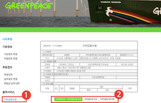 그린피스 홈페이지에 로그인 하시면, 24시간 쉽고 편리하게 다운로드 및 출력을 하실 수 있습니다. 증빙서류(그린피스 고유번호증)도 함께 다운로드 및 출력 하실 수 있습니다.