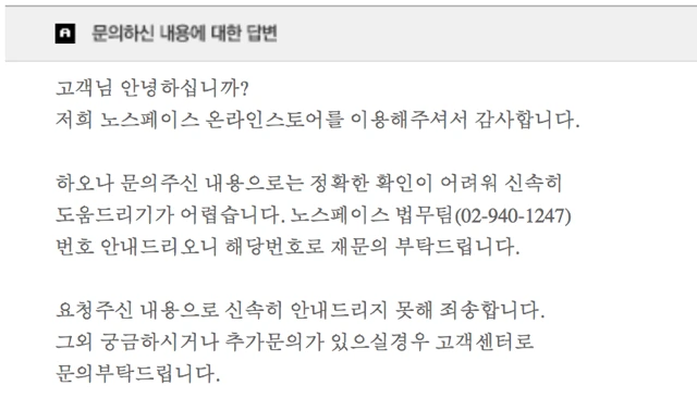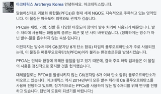 우리나라에서뿐만 아니라 전 세계적으로 높은 시장 점유율을 유지하고 있는 노스페이스는 PFC에 대한 소비자의 문의에 다소 성의 없는 답변을 해주었습니다. 가장 실망스러운 점은, 제품에 관한 문의를 법무팀을 통해 안내받으라는 것이었습니다.