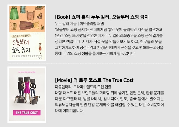 이제 패션에 민감해지기 위해서는, 얼마나 최신 유행인지를 떠나 어떻게 생산된 ‘무엇’을 입었느냐에 더 신경 써야 할 것입니다. 2016년의 새로운 목표에 ‘지구를 살리는 착한 소비하기’를 넣어보는 건 어떨까요?