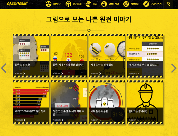 그린피스는 지난 2015년, 후쿠시마 원전 사고 4주기를 맞아 국내 원전 사건•사고 정보공개사이트 ‘나쁜 원전 이야기'를 공개했습니다. 이 사이트에서는 한국 원전의 잦은 고장 및 사고, 비리, 다양한 안전 문제를 한 눈에 살펴보실 수 있습니다.