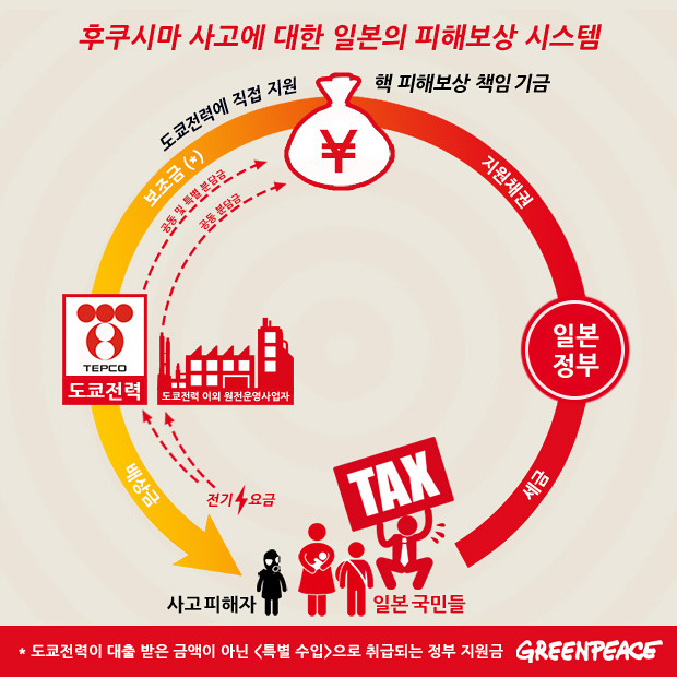 이들에 대한 피해 보상은 제대로 이루어지지 않고 있습니다. 그 이유 중 하나는, 후쿠시마와 같은 원전 사고가 발생해도 원전 제조업체들은 그 피해 비용을 전혀 부담하지 않기 때문입니다. 그 부담은 고스란히 시민들에게 전가되고 있습니다(우리나라의 경우에도 이런 피해 보상 체계는 크게 다르지 않습니다. 원전에서 사고가 발생할 경우, 운영기관인 한국수력원자력은 약 5,000억 원 정도까지만 배상 책임을 집니다. 나머지 천문학적 피해에 대한 보상은 고스란히 국민들에게 떠넘겨지게 됩니다.).