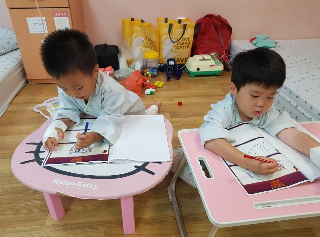 병원에 입원해서도 사이좋게 한글 공부를 하던 형제들