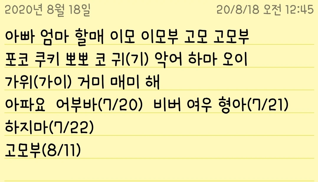 그때 당시 적었던 아이가 말할 수 있는 단어들