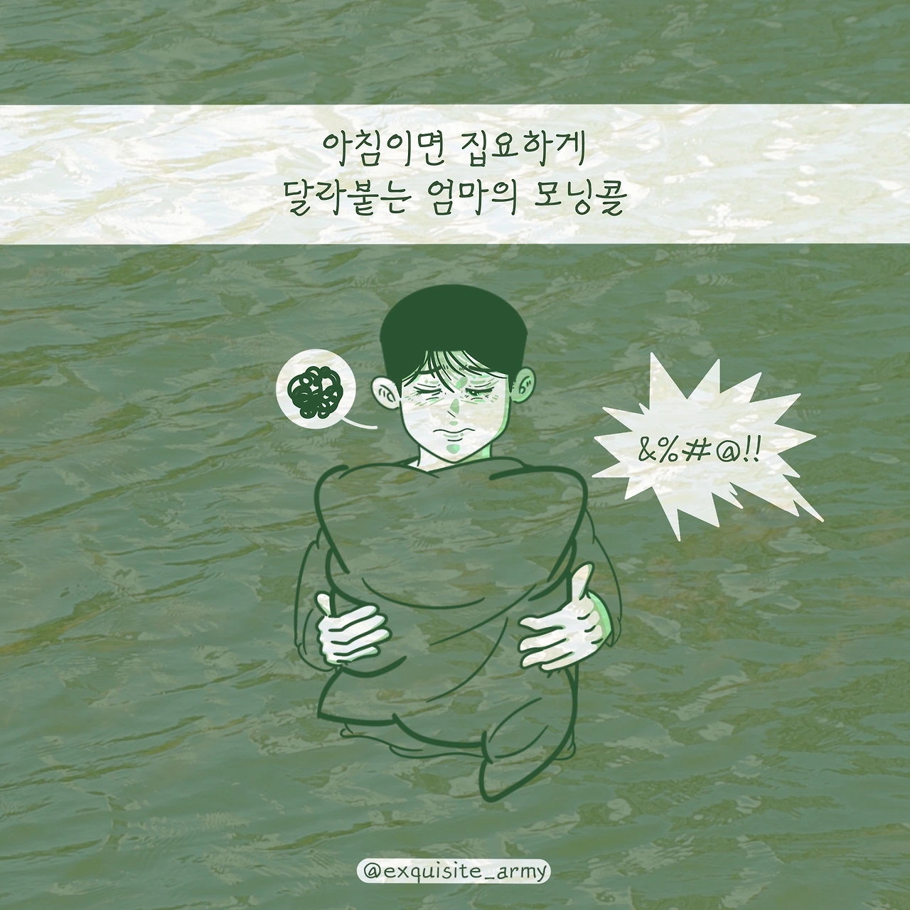 그 순간 지지직거리는 스피커 잡음에서 들리는 요란한 기상나팔소리.