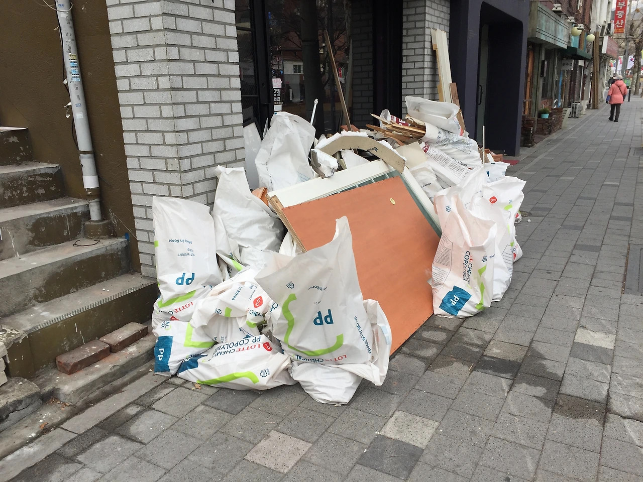 가구를 버리는 방법도 생각보다 ‘간편’합니다. 일정 크기 이상의 가구는 ‘대형 폐기물’로 간주하여 지자체에서 지정한 폐기물 수거 업체에 신고하고 처리 비용을 지급해야 합니다. 일명 ‘스티커’라 하지요. 스티커를 붙여 내 집 밖에 내놓으면 알아서 가져가 처리합니다. 재활용하는지 매립하는지는 아무도 따지지 않고, 일단 눈에서 보이지 않으니 어떻게 처리되는지는 더 이상 내 소관이 아니게 됩니다. 벽이나 타일을 뜯어냈거나, 걸레받이나 몰딩을 교체하는 시공 후에는 ‘건설 폐기물’이 발생합니다. 특수한 재질인 경우가 많아 반드시 적법하게 분리 배출해야 합니다. 5t 이상이면 allbaro.or.kr 홈페이지에서 신고서를 작성 후 배출 신고를 하고, 5t 이하라면 건설 폐기물 전용 봉투에 담아 일반 종량제 봉투처럼 집 앞에 배출하면 됩니다. 사실, 건설 폐기물 수거-처리업체에 연락하면 ‘알아서 다 처리해준다’는 팁도 온라인에서 심심치 않게 돌아다닙니다.