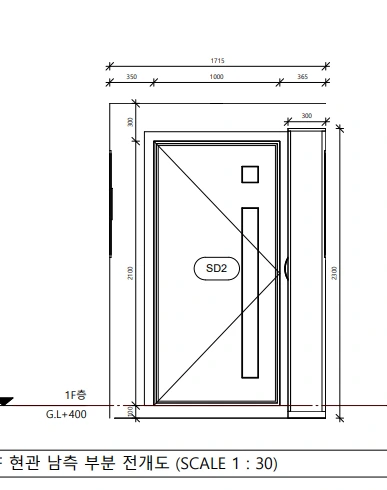 현관문 설계도. 대문이 남쪽이라서 전개도에 치수 상세, 현관문의 부속품 설계, 현관의 3D 설계
