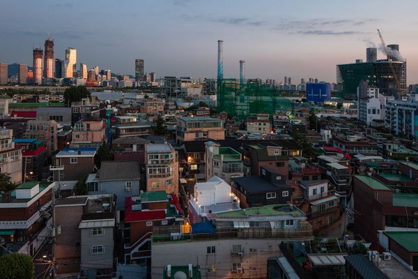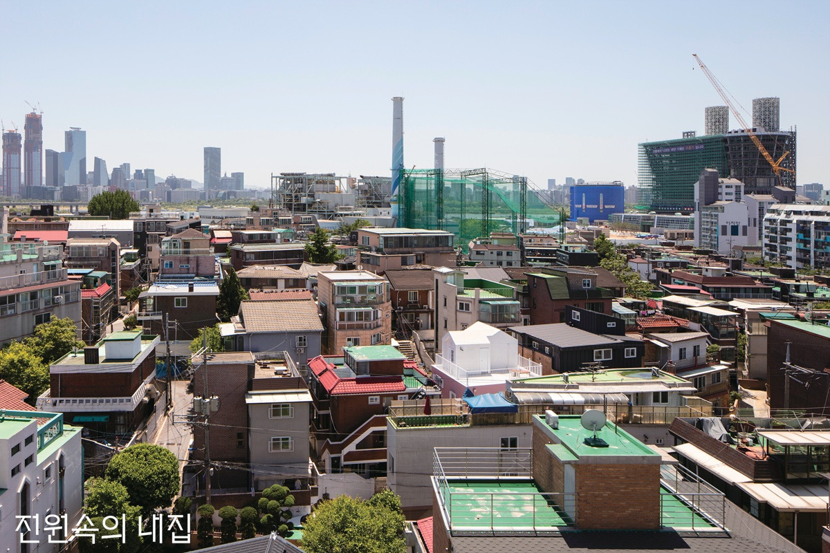 저녁 무렵 노을이 지는 동네 풍경, 집 짓기 전의 단독주택, 구름 한 점 없이 맑게 개인 동네 풍경, 이 사진들을 찍기 위해서는 종일 걸리는걸 알았다 : 진효숙 사진 작가 촬영