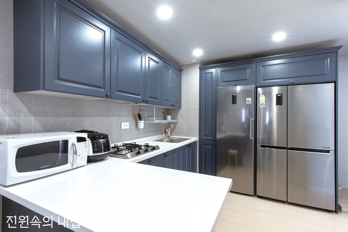 주방에 대한 로망이 강하다 보면 주방은 넓어야 한다고 생각하기 쉽다. 그런데 넓은 주방을 사용하다 보면 오히려 아일랜드 싱크대 위는 온갖 잡다한 것들이 쌓이기 십상이다. 4-50평대의 아파트에 거주하다 보면 거실 확장과의 시선 감으로 주방은 더 넓어 보인다.