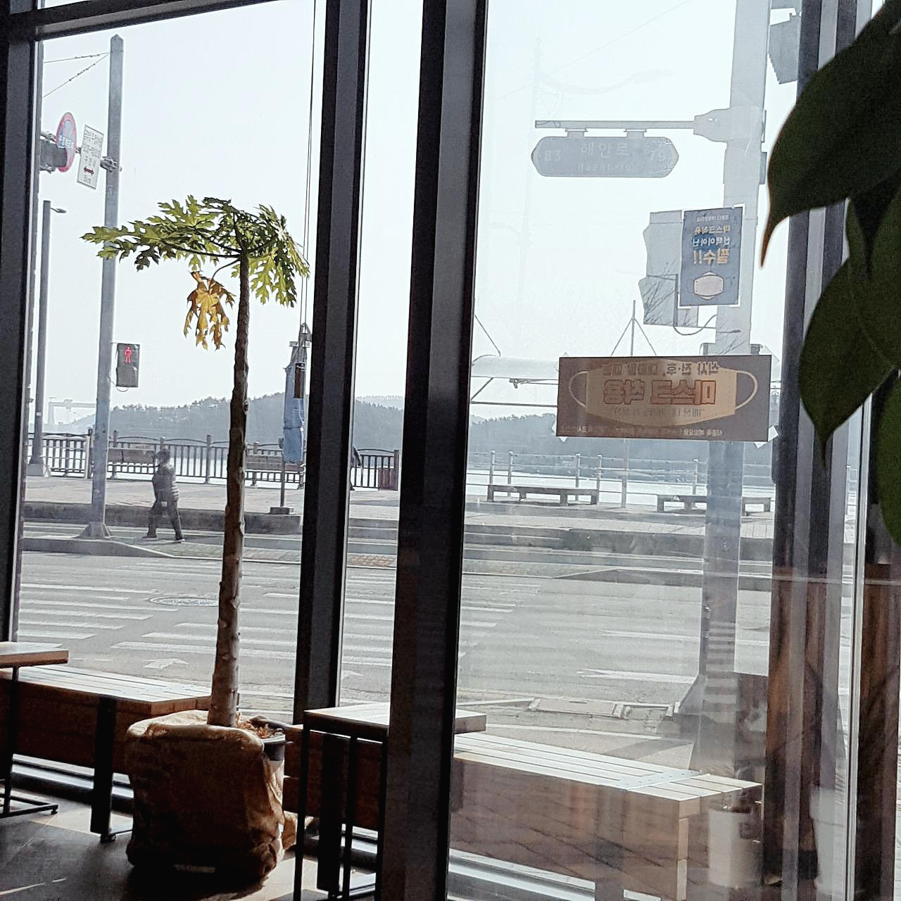 목포의 어느 겨울 바닷가 카페, 누군가 바닷가 벤치에 말없이 앉아 있었다