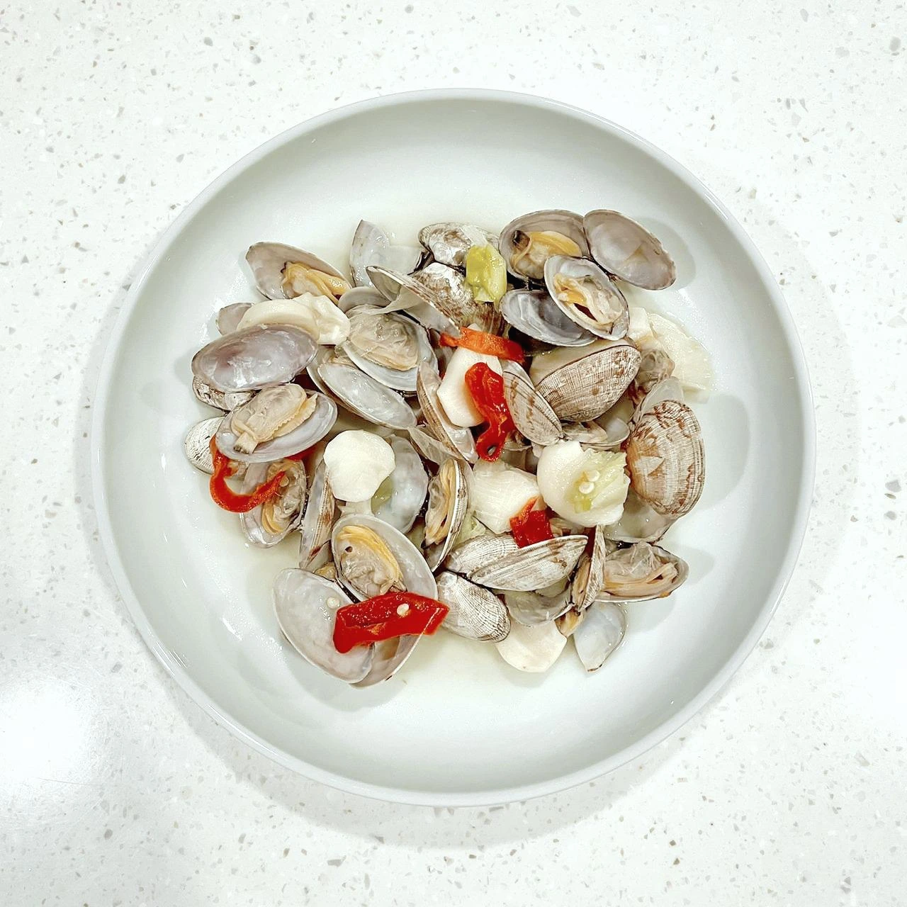 2. 바지락, 홍고추, 청양고추 넣어 볶다가 바지락이 입 벌리면 술 붓고 뒤적여서 불 끕니다.