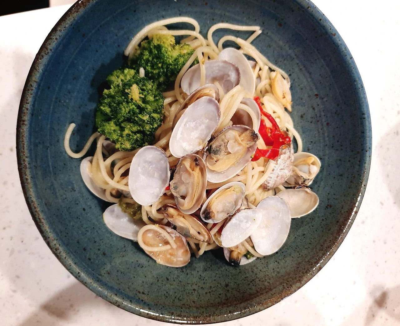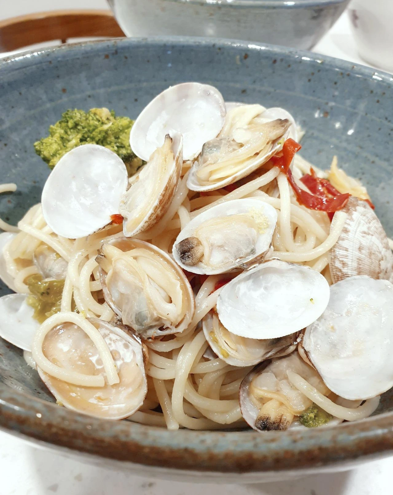 재료 : 바지락, 파스타면, 마늘, 홍고추, 청양고추, 브로콜리