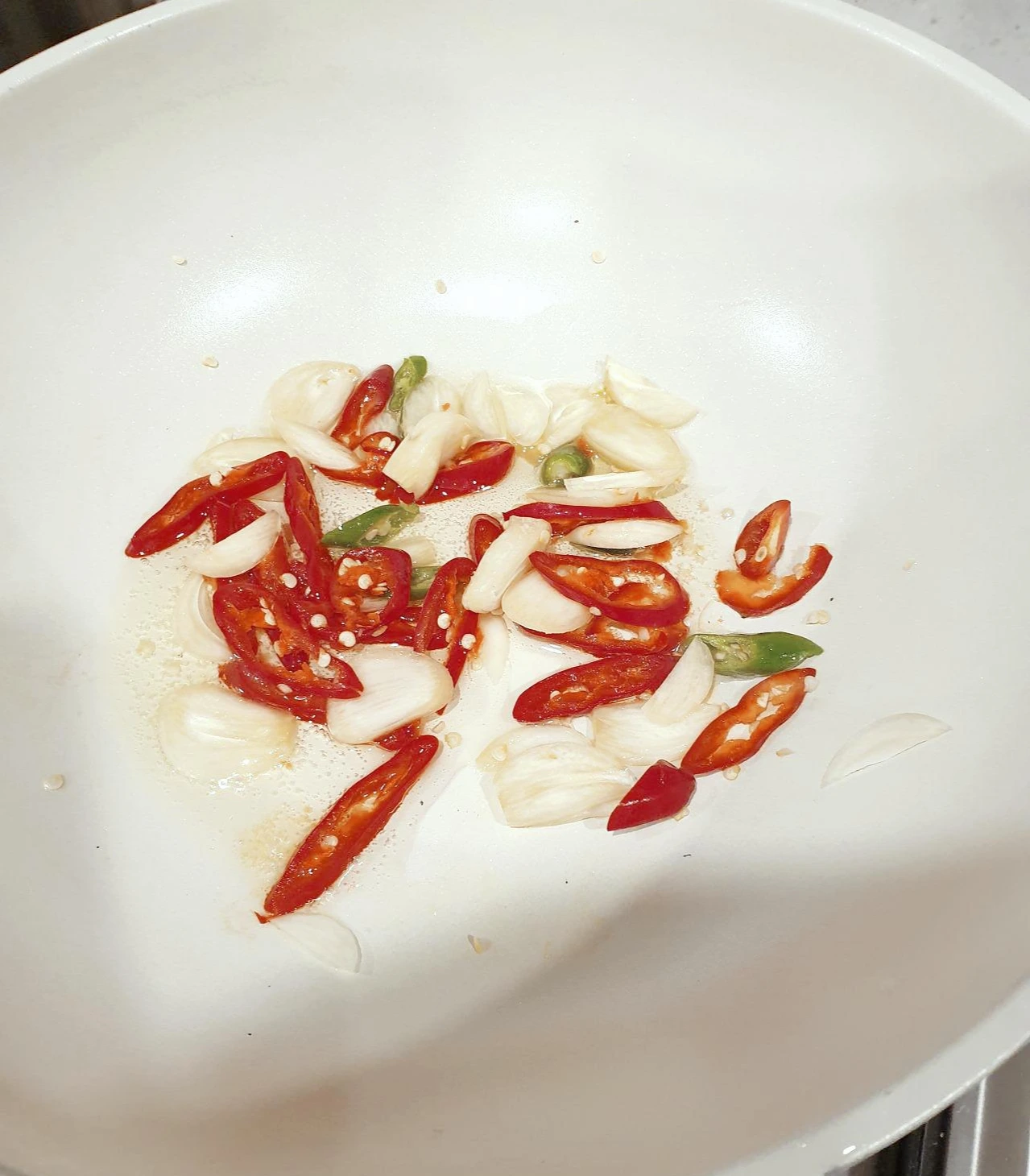 마늘 편, 홍고추, 청양고추 볶은 후에 야채 볶고, 바지락 넣기