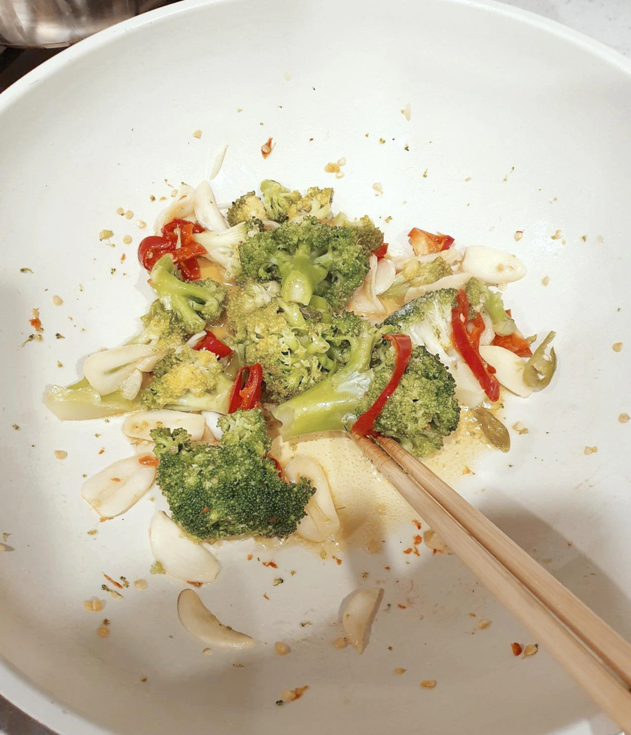 2. 마늘은 편으로 썰고, 홍고추와 청양고추도 썰어 올리브유에 볶다가 브로콜리도 볶아 둡니다.