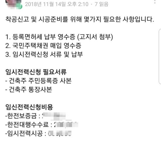 임시전력 신청 필요서류에는 건축주 주민등록증 사본, 건축주 통장사본이 들어가야 한다.