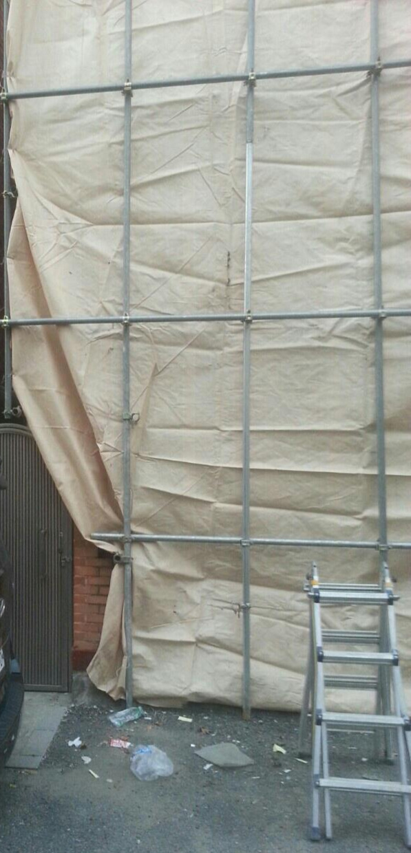 철거 준비 완료. 건축허가 표지판, 철거 등 건축공사 사전 안내 표지판을 설치, 구옥을 빙 둘러 비계 설치