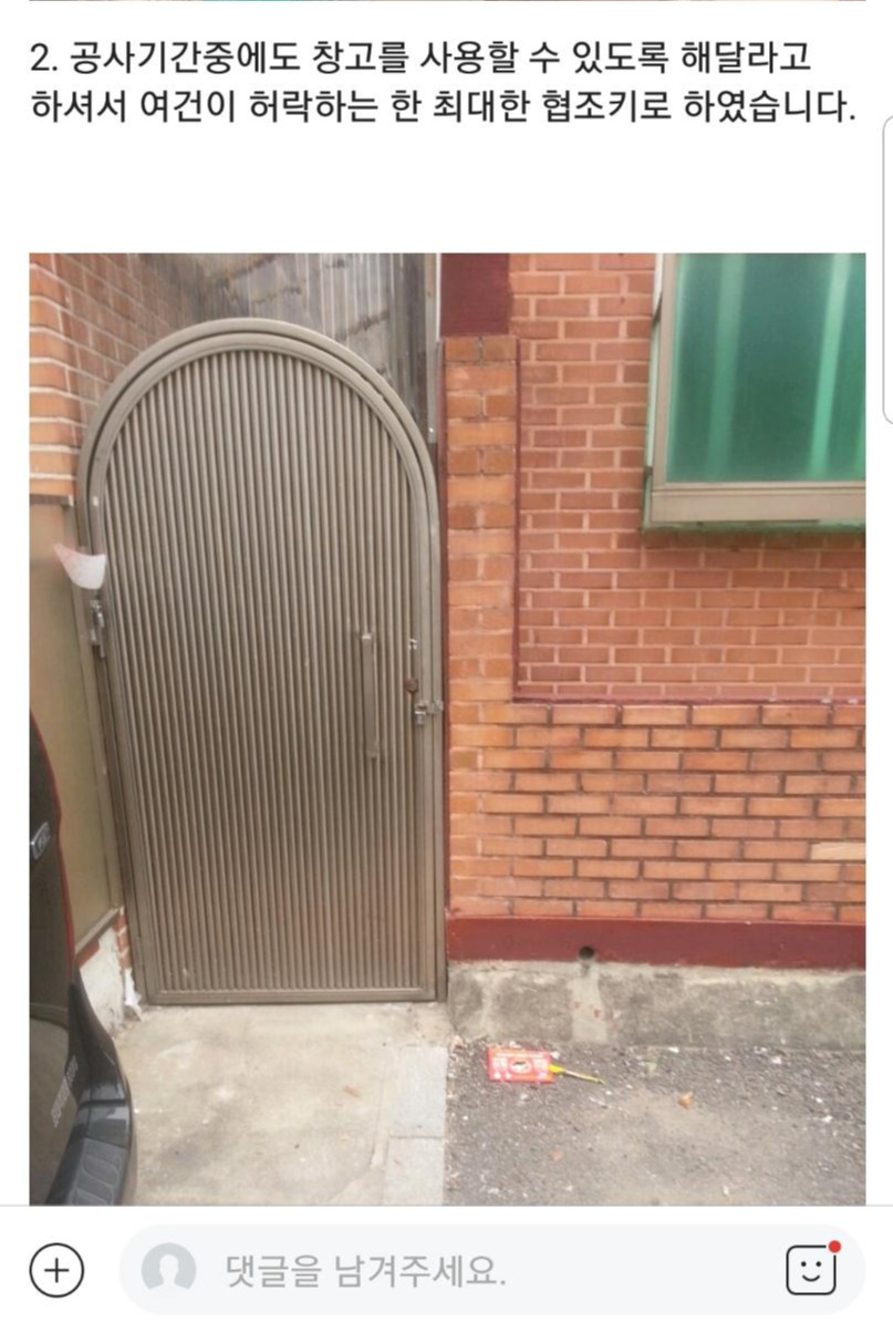 옆집과의 사이에 이격거리를 두는 골목은 우리가 구옥을 구매하기 이전부터 쇠문을 달아서 옆집이 사업에 사용하는 많은 자재들을 넣어두는 창고 역할을 하고 있었다. 사실은 저 골목을 폐쇄하면 만약 응급상황이 벌어질 시는 심각한 일이 발생하겠지만 이웃과의 분쟁을 피하기 위해서 지금도 어쩔 수 없이 두고 있다.