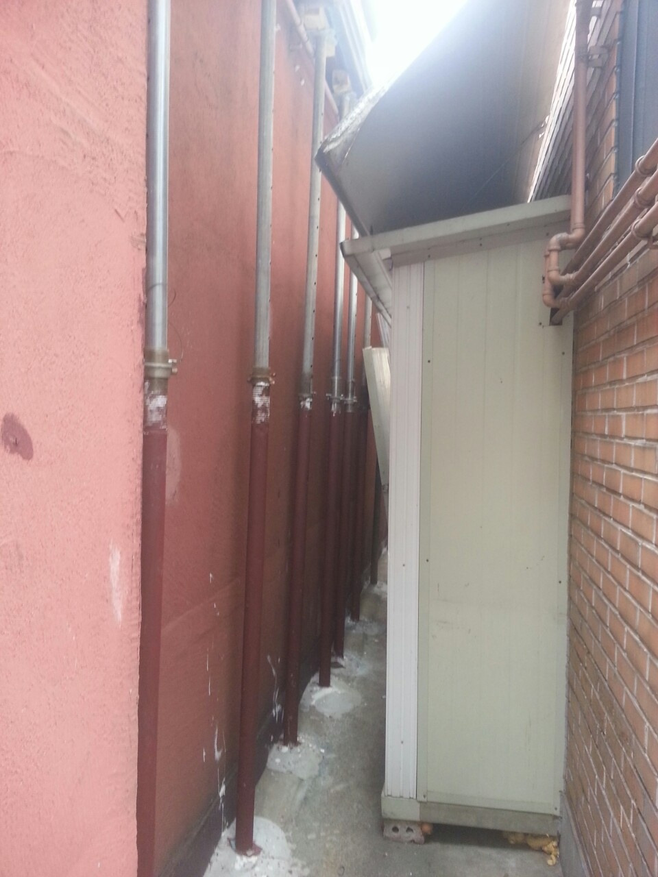이격거리 골목에 달린 문을 열고 보니 구매한 구옥의 2층을 가까스로 받치고 있는 쇠기둥들과 옆집이 창고로 사용하는 골목