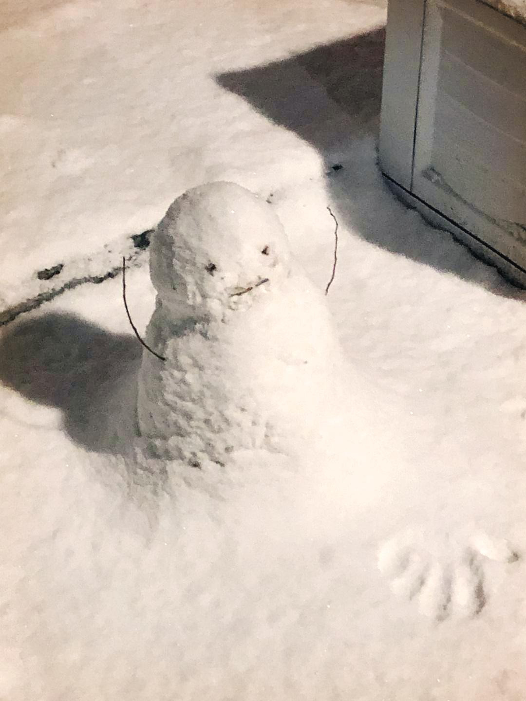 폭설로 덮혔던 눈도 녹았지만, 눈사람만은 녹지 않고 뽐내고 선 골목 풍경