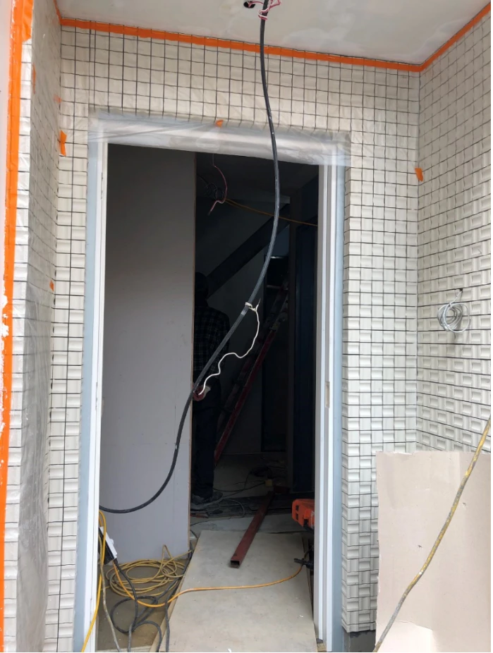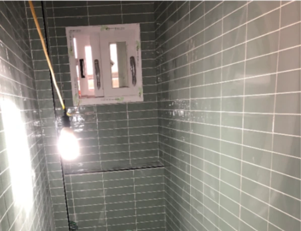 근생 공간 화장실은 어두운 바닥을 했다. 근생 화장실 벽은 65*265 크기의 민트색 유광으로 하니 고급스러워 보이고 보기가 좋았다. 작은 타일은 시공이 더 어렵고 손이 많이 간다고 했다. 그래서 화장실 타일 시공이 오래 걸렸다.