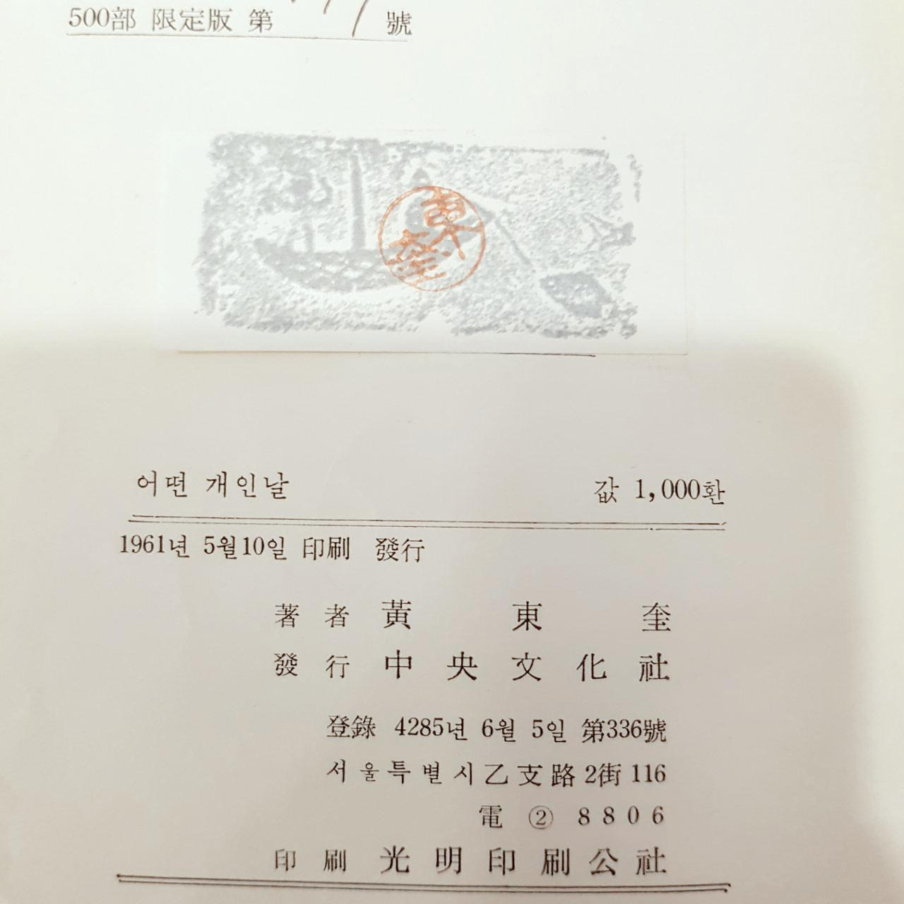 <어떤 개인 날> 표지, 1961년에 <중앙문화사>에서 500부 한정판으로 발간한 초판본, 값은 1000환