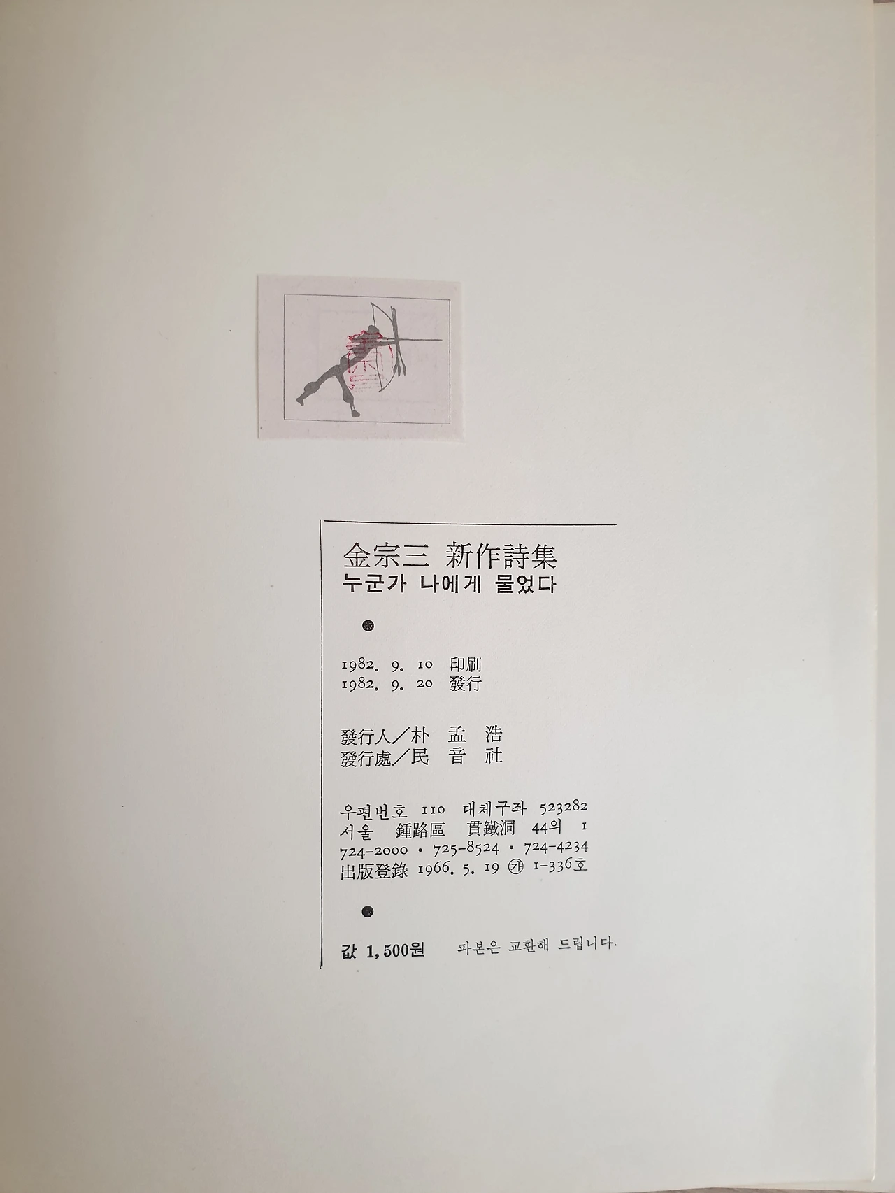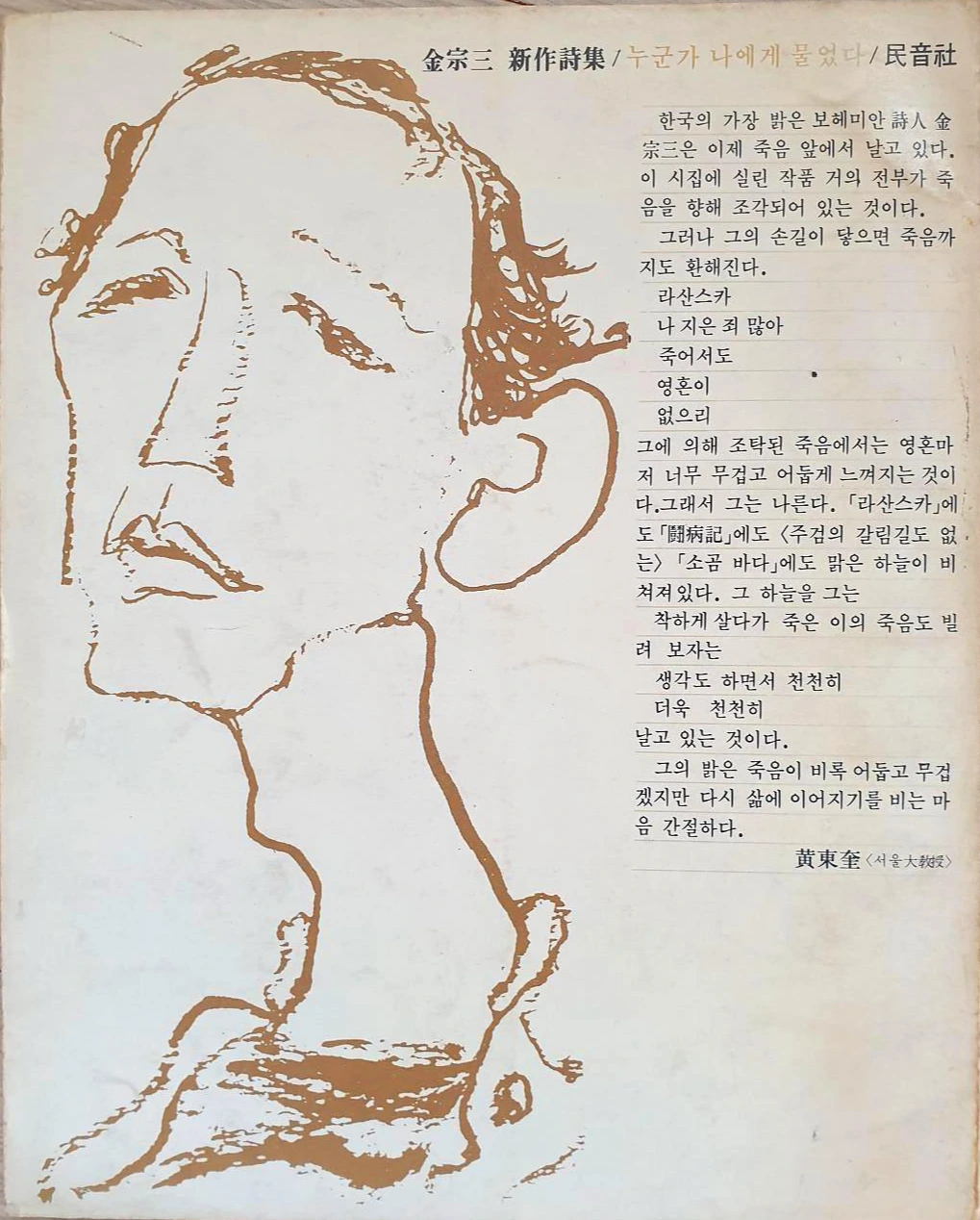 왼쪽은 시집의 표지, 오른쪽은 뒤 표지, 소묘는 시인이자 화가인 김영태의 그림, 1982년 초판, 값은 1500원