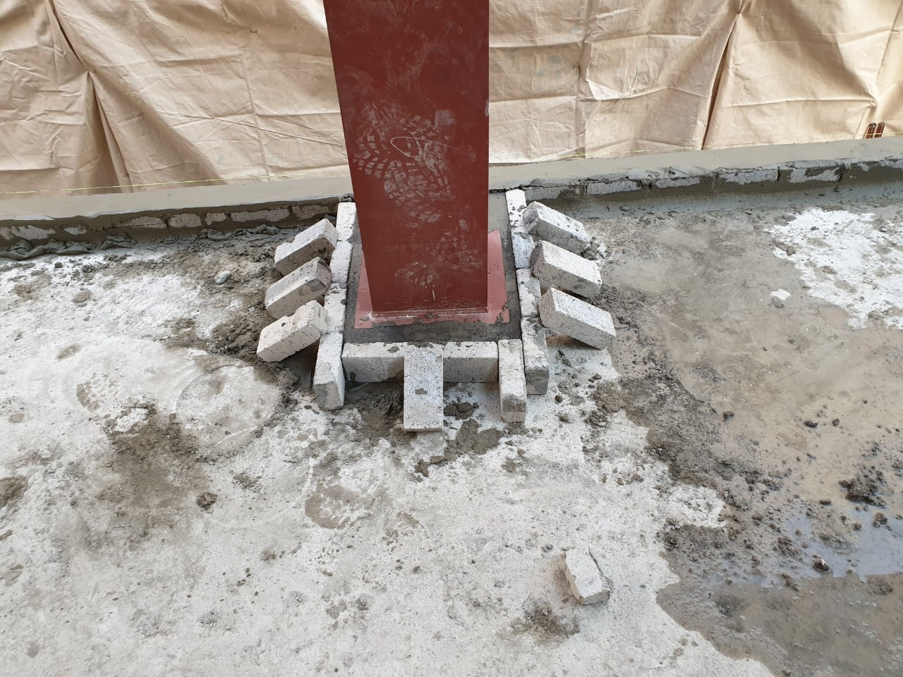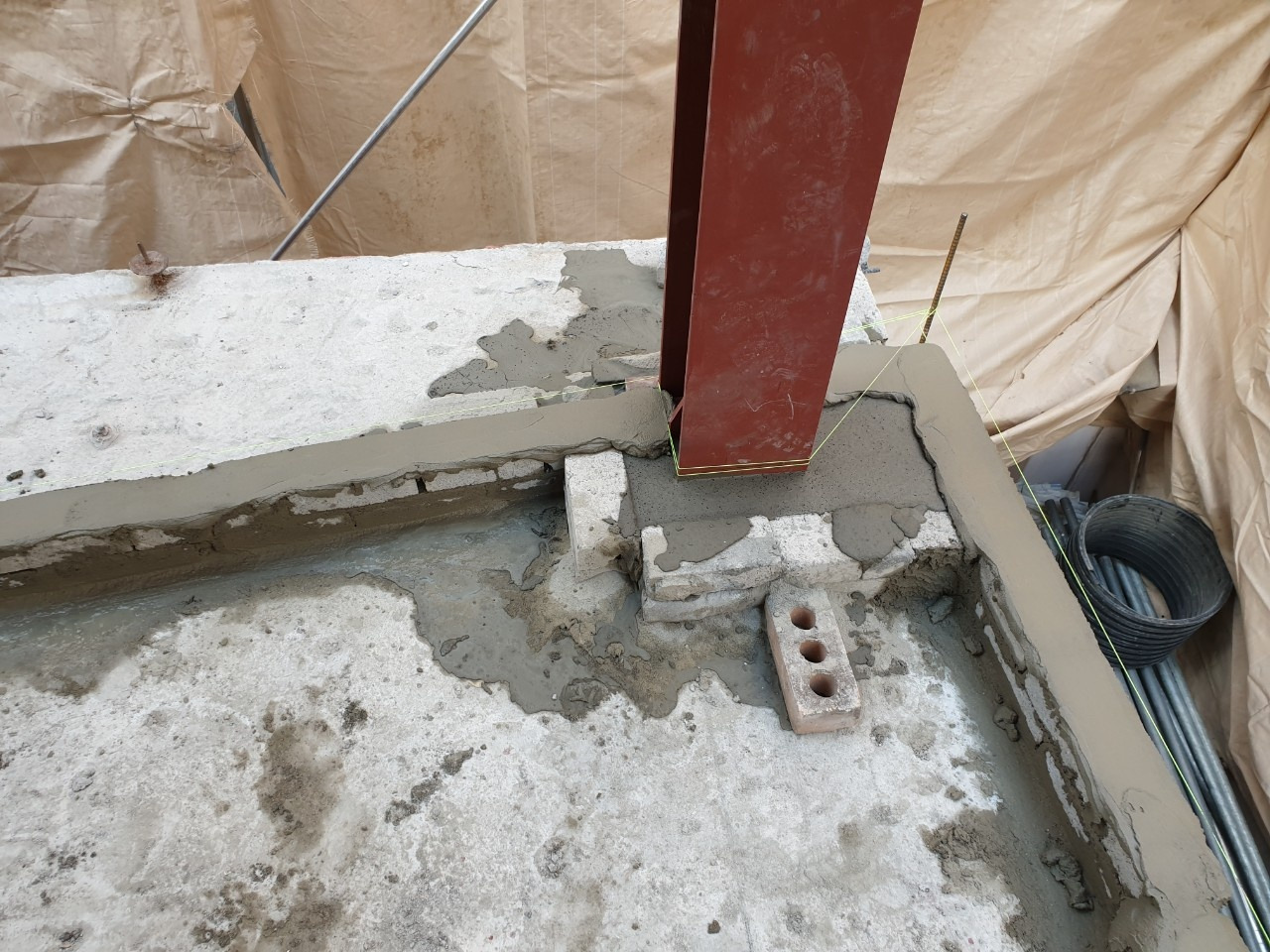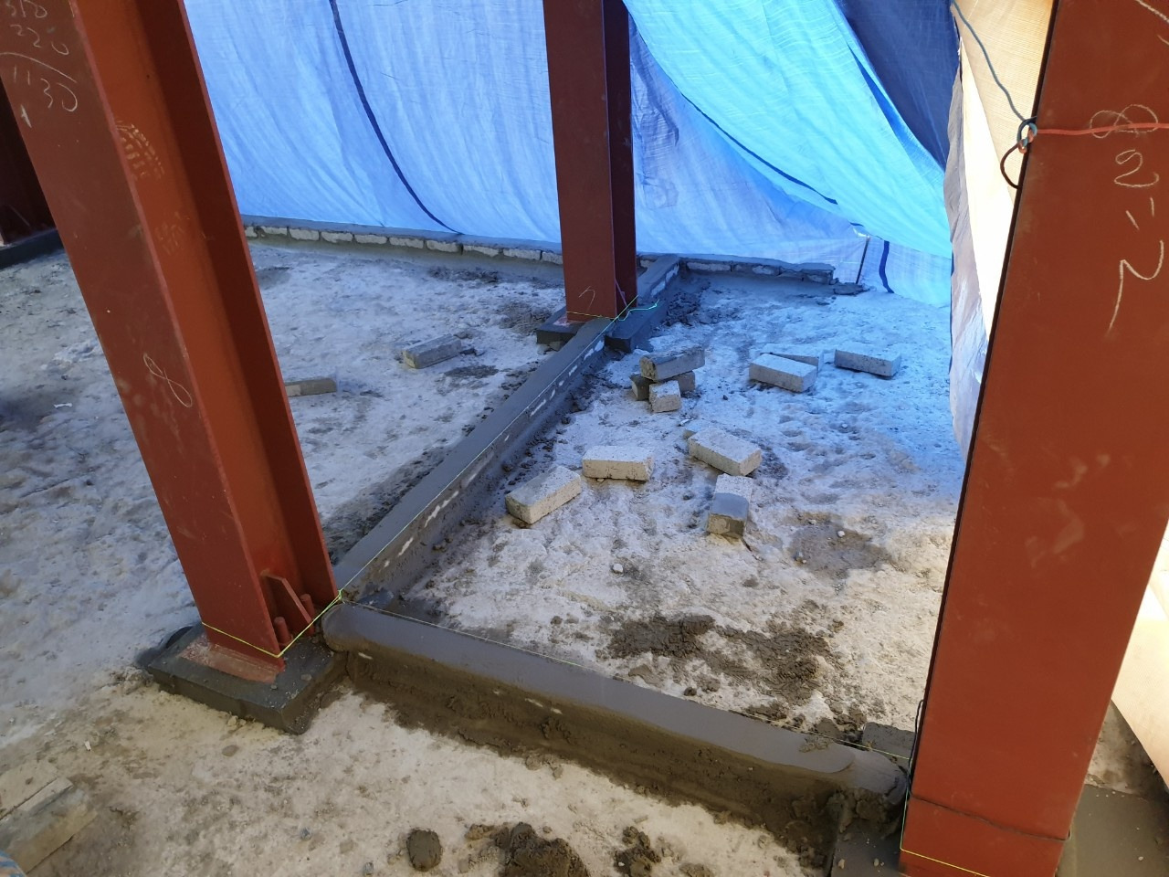1층과 마찬가지로 빔과 2층 바닥 사이 무수축 몰탈 시공도 병행한다. 1층처럼 흔들림을 방지하는 벽돌을 쌓아 작업한다.