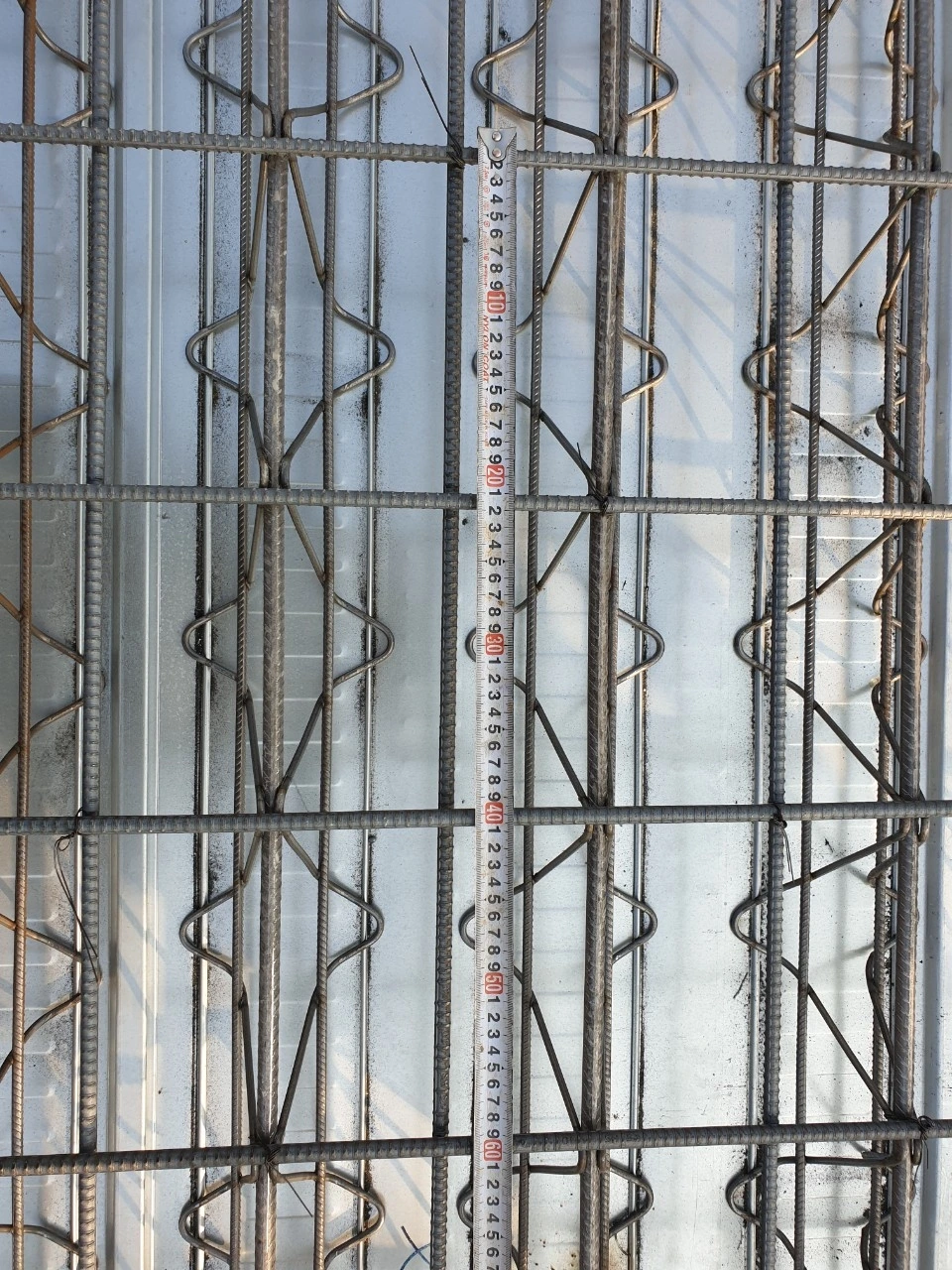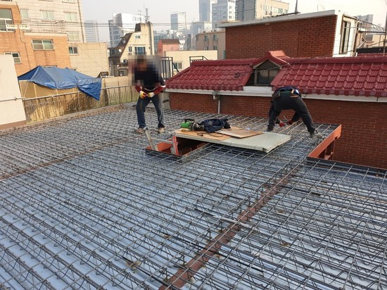 2, 3층 데크플레이트 작업은 간격을 맞추기 위해 열심히 자로 재어서 시공한다. 배근 간격은 10cm, 20cm로 보인다. 어떻게 해야 잘 되는 것인지는 모르지만 촘촘한 것이 좋아 보인다. 긴밀함이 집을 유지하는데 아무래도 튼튼해 보일 듯하다.
