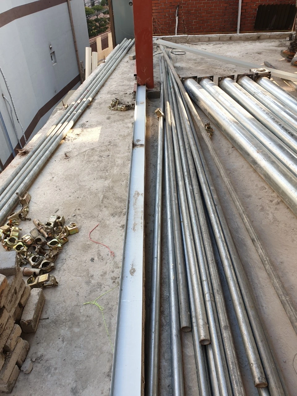 다음 작업은 판넬 작업이 이어질 예정이다. 현장 작업에 이용할 비계 설치를 할 철근들이 들어왔다. 이전의 비계는 집을 철거하는 용도의 비계여서 새로 설치해야 하는 모양이다.