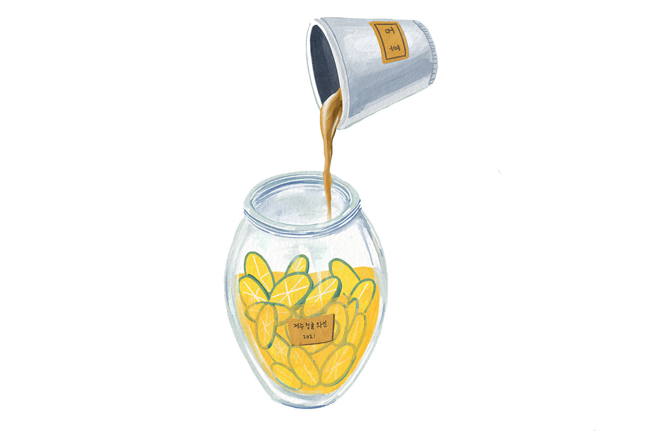 설탕을 청귤에 쳐서 김장하듯 버무리고