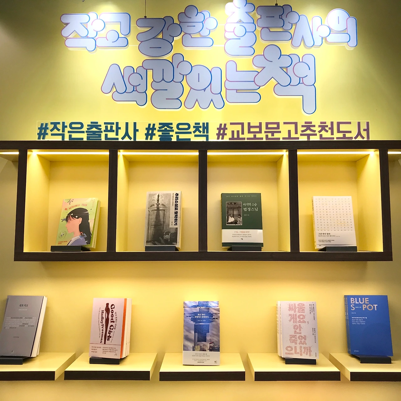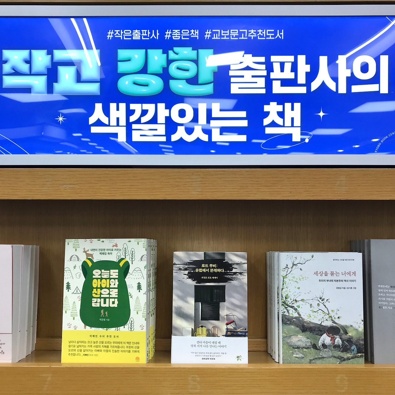 그리고 집으로 돌아와 용기를 내 서점 담당자님에게 발주 요청 메일을 넣었고, 곧 추가 발주 연락이 왔습니다. 그런데 뒷날, 이상한 현상이 일어나기 시작했습니다. 책 판매가 저조했던 지점에서 다량의 물량을 가져가기 시작했던 것이었습니다. 책의 재고 위치를 파악하자, 그것은 다름 아닌 '작고 강한 출판사의 색깔있는 책'이라는 코너였습니다. 한 달이 지나고 이제 서점에서 내 책은 사라질 운명인가, 할 즈음에 생긴 뜻밖의 소식이었습니다. #작은출판사 #좋은책 #교보문고추천이 적힌 교보문고 목동점, 광화문점, 잠실점, 강남점, 영등포점의 예쁜 벽면과 코너를 돌며 사진을 마구 찍어댔습니다.