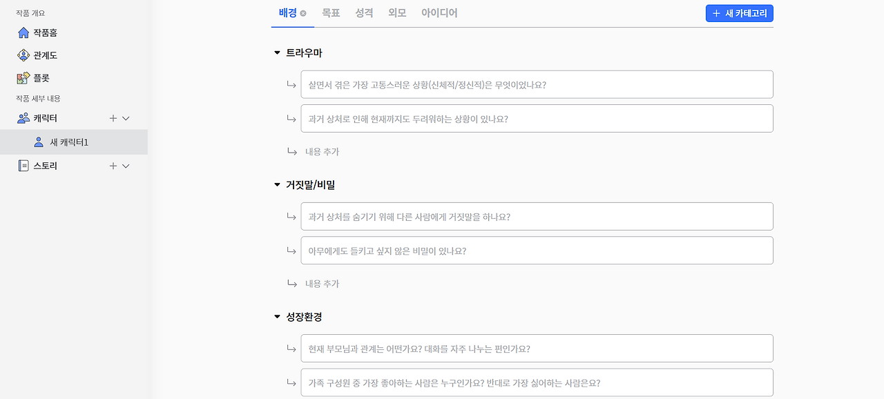 캐디터는 캐릭터의 배경, 목표, 성격, 외모, 아이디어 등 캐릭터 하나를 만들기 위해 필요한 모든 세팅이 마련되어 있는데요. 섹션 하나하나에도 작가가 캐릭터에 대한 세계관을 수월하게 확장할 수 있도록 가이드라인을 촘촘하게 제시해주고 있습니다. '기정'이라는 캐릭터로 배경 빌딩을 해볼까요? '기정'이라는 캐릭터와 대화를 한다고 생각하면 더 편하겠죠?