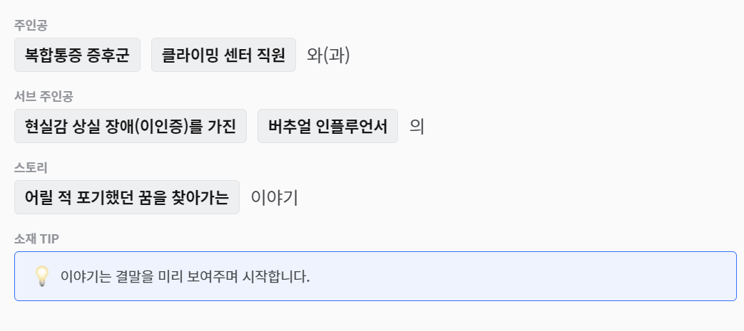 생각지도 못한 의외의 조합이죠? 클라이밍과 버추얼 아이돌이 요즘 대세라고는 하지만.. ㅎㅎ 어떻게 보면 낯설지만 한편으로는 그래서 더 흥미롭고 재미있는 이야기가 될 것 같은데요. 여기서 참고로 하단의 '소재 TIP' 란을 참고하시면 작품의 뼈대를 잡아가는데 더 도움이 되실겁니다!