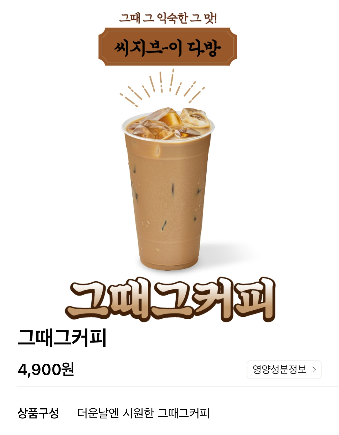 그때그커피는 말 그대로, 아는 맛이 더 무서운 달콤한 옛날커피 맛입니다. 무더운 여름날 한 줄기 빛, 오아시스 같은 시원한 얼음 믹스커피를 마시는 기분인데요. 저는 집에서 아무리 만들어도 이 맛이 안 나더라고요.. CGV에서 사 먹고 대만족 했습니다.