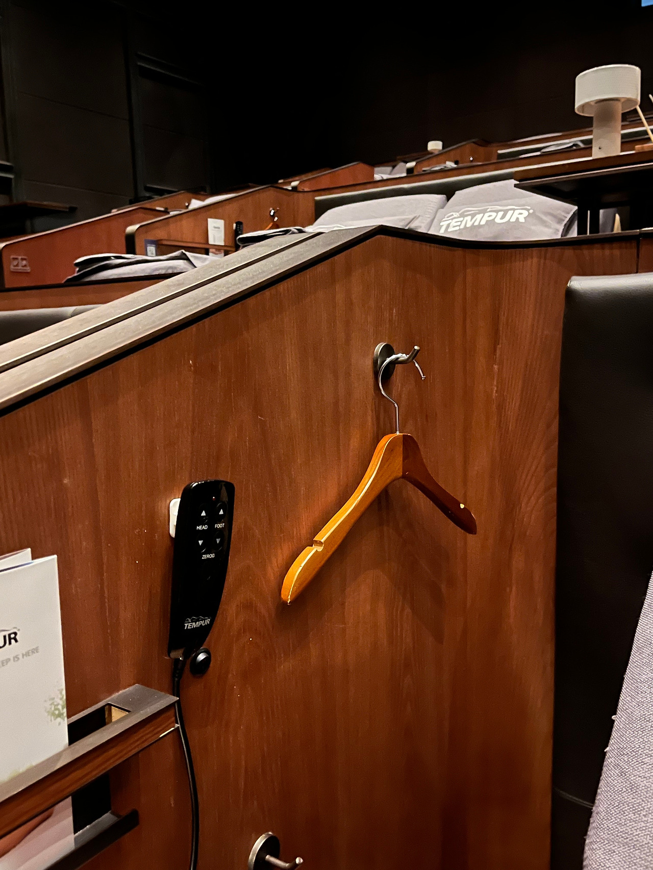 또, 겉옷을 편하게 보관할 수 있는 옷걸이가 좌석마다 배치되어 있고, 침대의 높낮이를 편하게 조절할 수 있는 리모컨도 구비되어 있었습니다. 침대 높낮이 조절할 때, 소리 없이 부드럽게 조절되는 점이 좋았습니다. 영화 상영 중에도 소리가 나서 혹시 방해가 될까 걱정할 필요 없이 편하게 조절할 수 있었어요.