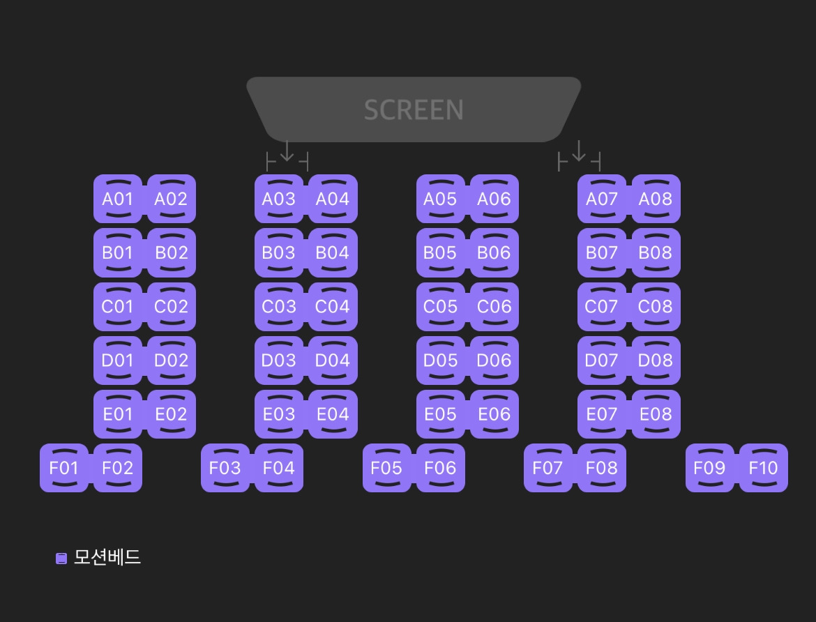 제가 선택한 좌석은 C열 3번과 4번인데요. 템퍼 시네마 명당 사수 꿀팁을 잠깐 알려드리자면, 저는 개인적으로 C열 3,4 혹은 5,6번 좌석을 추천드립니다. 너무 앞열과 너무 뒷열은 침대에 누워서 관람할 때 침대 높낮이를 조절하다 보면 스크린을 완전하게 다 볼 수 없는 시야가 되어 버릴 수 있어요. C열은 침대 높낮이를 조정해도 딱 시야에 스크린이 알맞게 들어오는 좌석이라 보다 편안하게 관람할 수 있는 명당이라고 생각합니다.