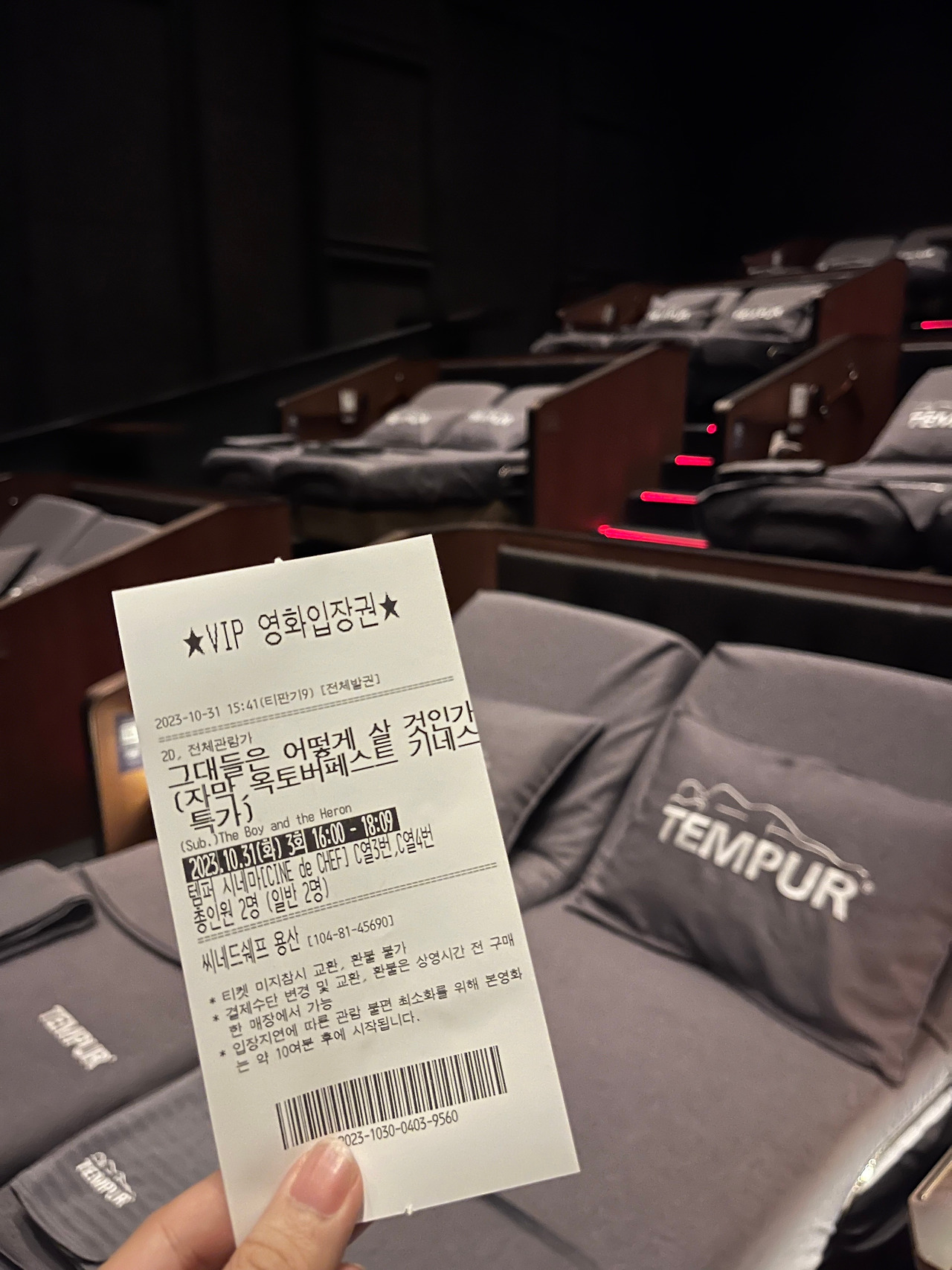 그래서 선택한 극장은 바로 CGV 씨네드쉐프 '템퍼 시네마'입니다. 이런 영화를 보려고 제 나름대로 꼭꼭 아껴두고 있었던 특별관이었는데, 지브리 영화 정도는 돼야 템퍼 시네마 관람에 걸맞다고 생각했습니다 ㅎㅎ