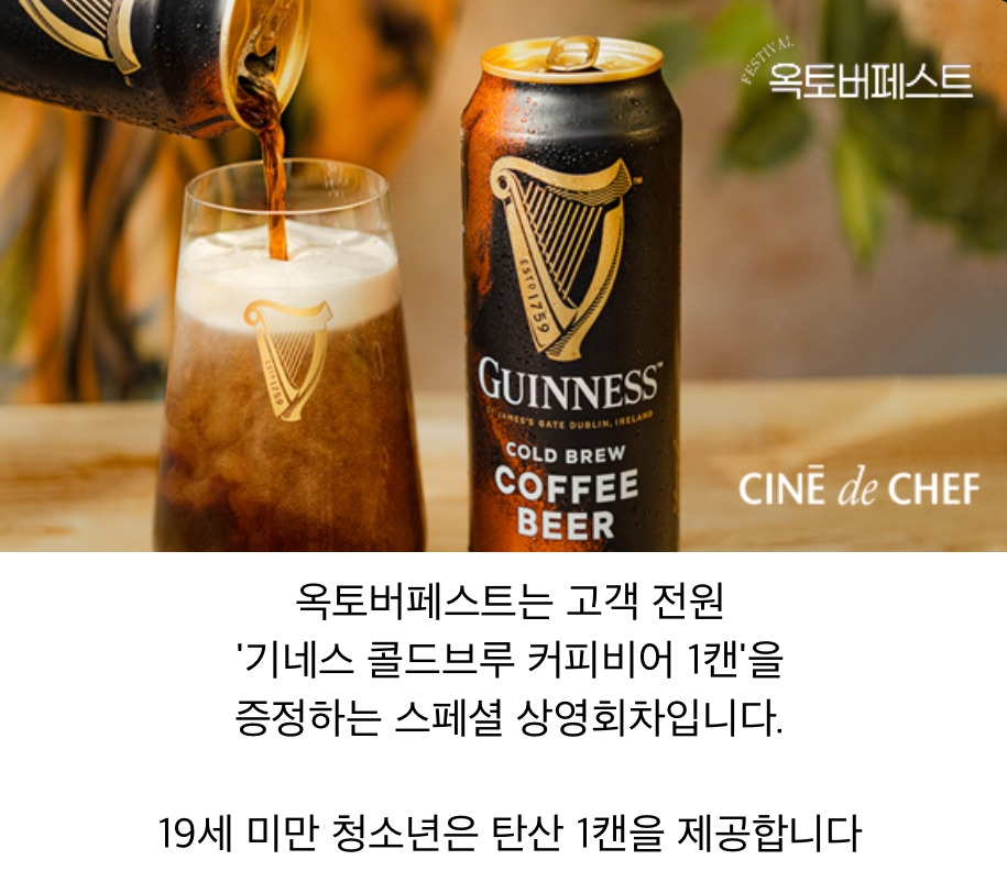 10월 '옥토버'를 맞아 독일 뮌헨의 맥주 축제 옥토버페스트처럼, 옥토버페스트 특가 기간 동안 씨네드쉐프 관람객 전원에게 '기네스 콜드브루 맥주'를 증정하는 행사였습니다.